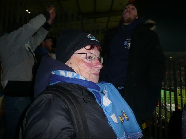 Colette devant la bâche au stade.